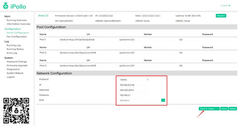 (a) Ingrese la dirección IP, la máscara de red, la puerta de enlace y el servidor DNS en los cuatro cuadros a continuación, luego haga clic en "GUARDAR Y APLICAR".