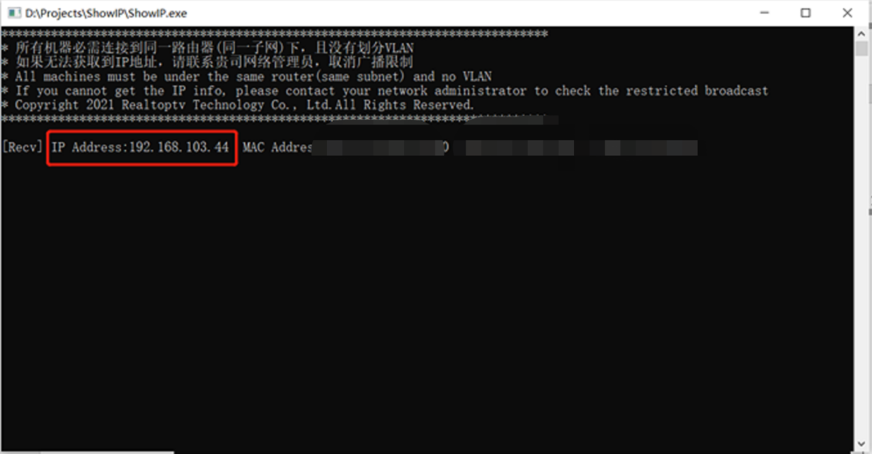 - The server IP information is fed back on the PC, as shown below: