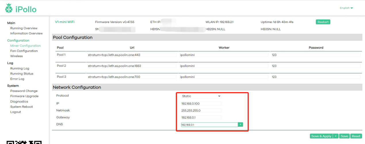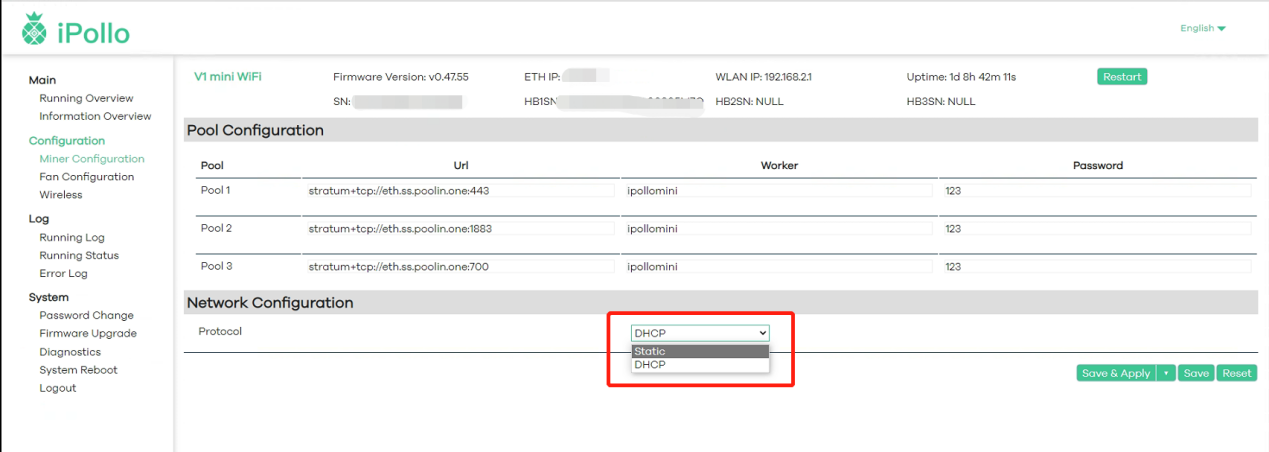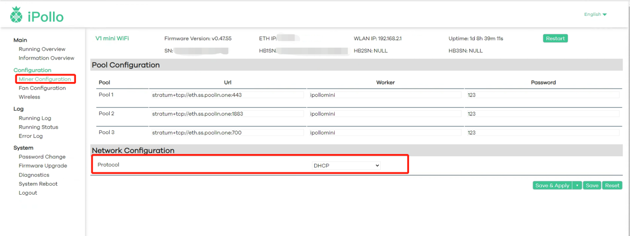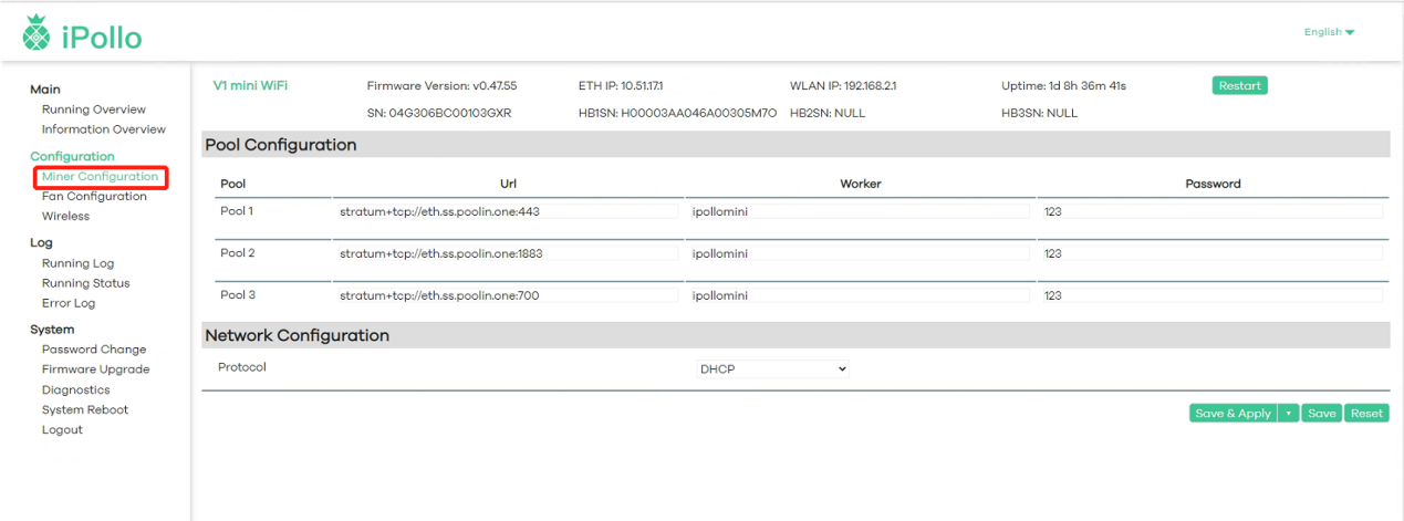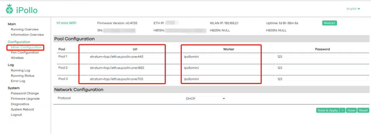 (1)Select "Pool Configuration" and fill in the Mining Pool Information