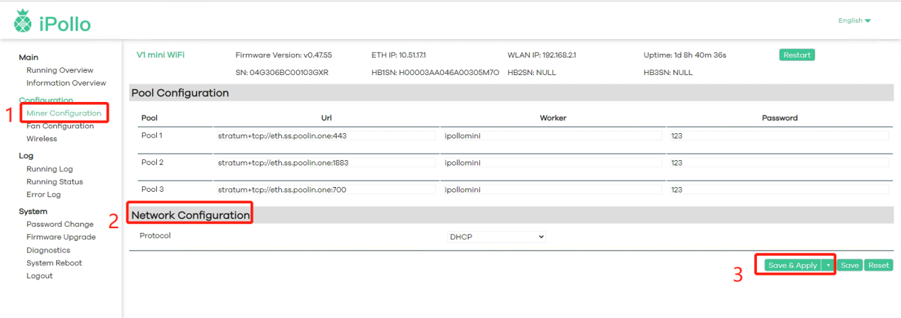 Note: In order to prevent “Pool 1” from being disconnected, causing the server to not work, it is recommended to set “Pool 2” and “Pool 3” at the same time, so as to ensure that the system will automatically switch to “Pool 2” or "Pool 3” for normal operation when “Pool 1” goes offline.