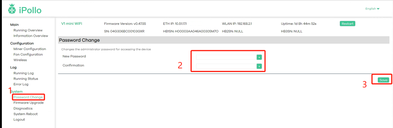 - Enter the modified new password in “New Password”, and enter the modified new password again in “Confirmation”, and then click “SAVE” below to take effect: