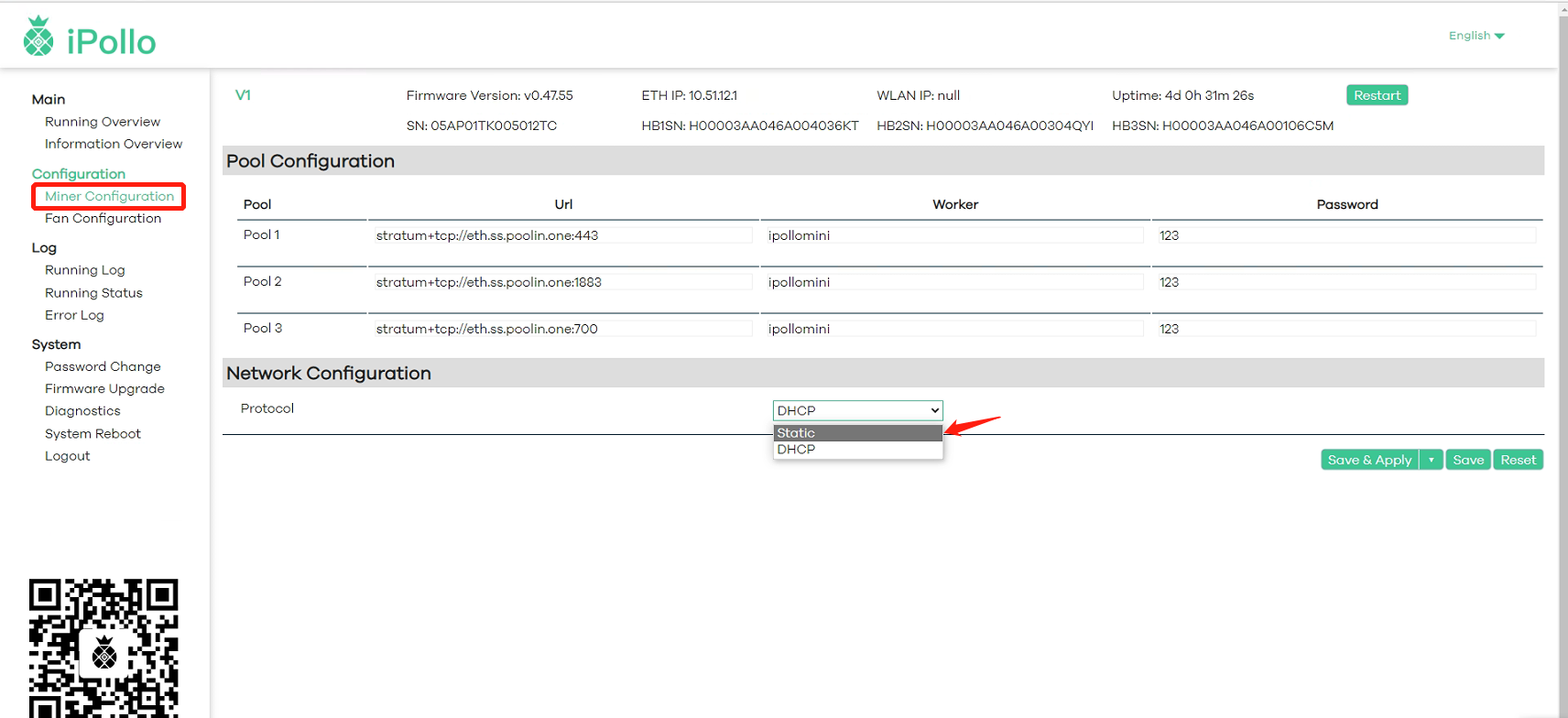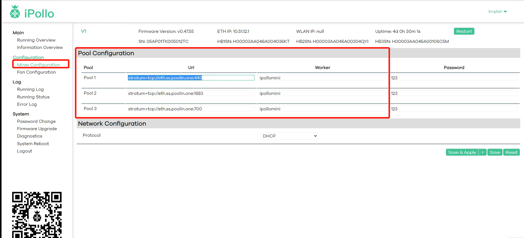 (1)Select "Pool Configuration" and fill in the Mining Pool Information