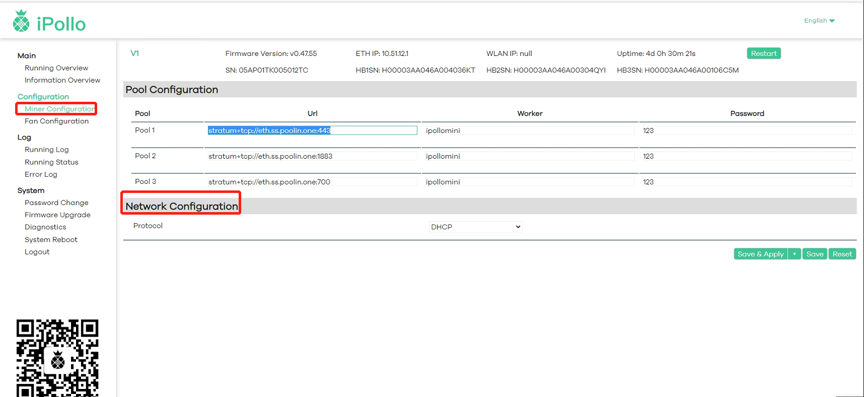 Click the "Miner Configuration" interface under "Configuration" to set the "Mining Pool" and "Network"